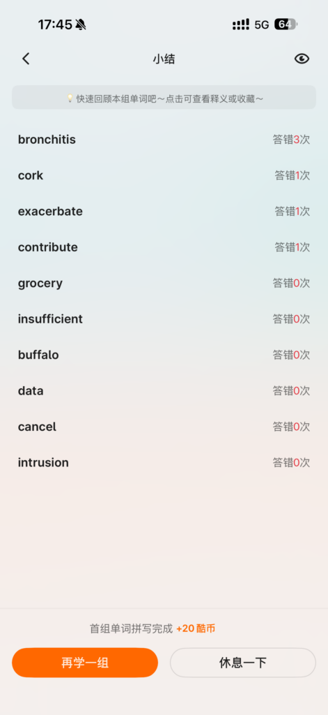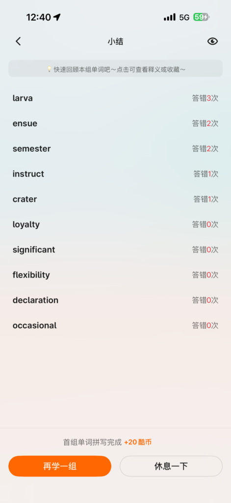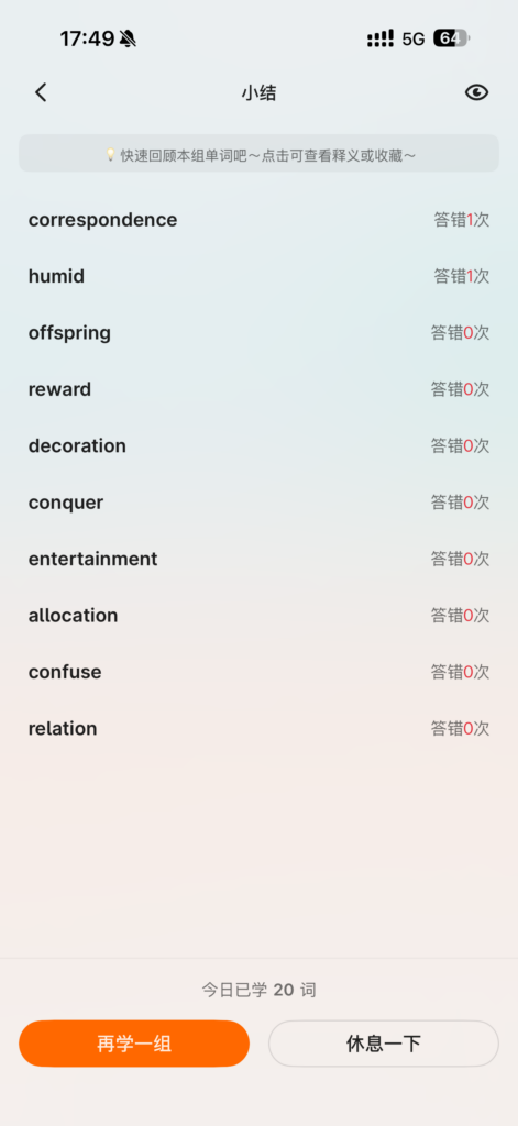 每日单词:Day39,40,41 作者: daidaimao 分类: 呆呆猫努力坚持 发布时间: 2026-03-29 12:42 💫 坚持英语记忆力 发表回复 取消回复您的邮箱地址不会被公开。 必填项已用 * 标注* * 在此浏览器中保存我的显示名称、邮箱地址和网站地址,以便下次评论时使用。